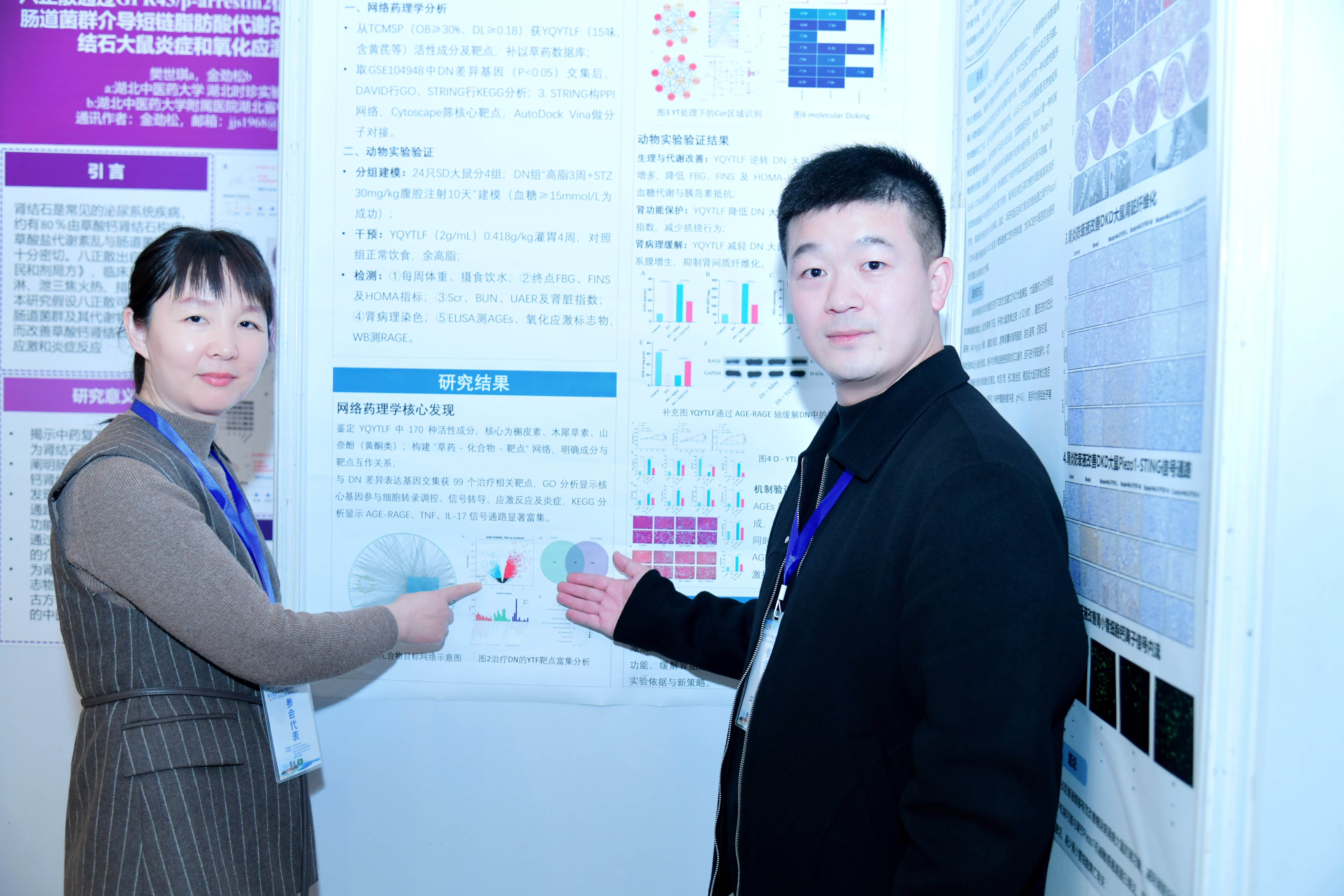 在这场多元的学术会议中,宇汝翠主任医师与倪伟建副主任药师团队合作的科研成果—“益气养阴通络方通过AGE-RAGE信号轴缓解糖尿病肾病”成为了亮点之一。该研究以壁报展示的形式,在会议期间与全国同道进行了深度交流与探讨,并因其研究视角的独特性、实验设计的严谨性以及较好的临床转化价值,荣获大会颁发的“优秀壁报奖”。这一荣誉不仅是对该单项研究成果的肯定,更是对药学部与中医内科长期坚持跨学科协同攻关模式的积极认可。研究成果聚焦糖尿病肾病这一临床难题,基于网络药理学、生信分析、药理学研究等技术手段深入揭示了经典中药复方“益气养阴通络方”在干预晚期糖基化终末产物(AGE)-其受体(RAGE)信号轴方面的分子机制,为阐释该复方治疗糖尿病肾病的科学内涵提供了新的实验依据,也体现了从传统经验用药向现代化机制阐释的深化。